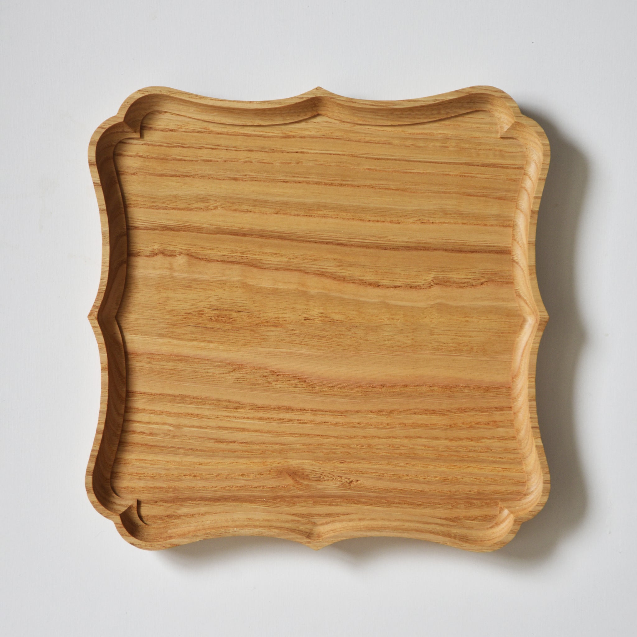稜花と呼ばれる伝統的な形に仕上げた正角のお盆です。一枚ものの国産の栗の無垢材を削り出したあと、一枚一枚手作業で仕上げました。